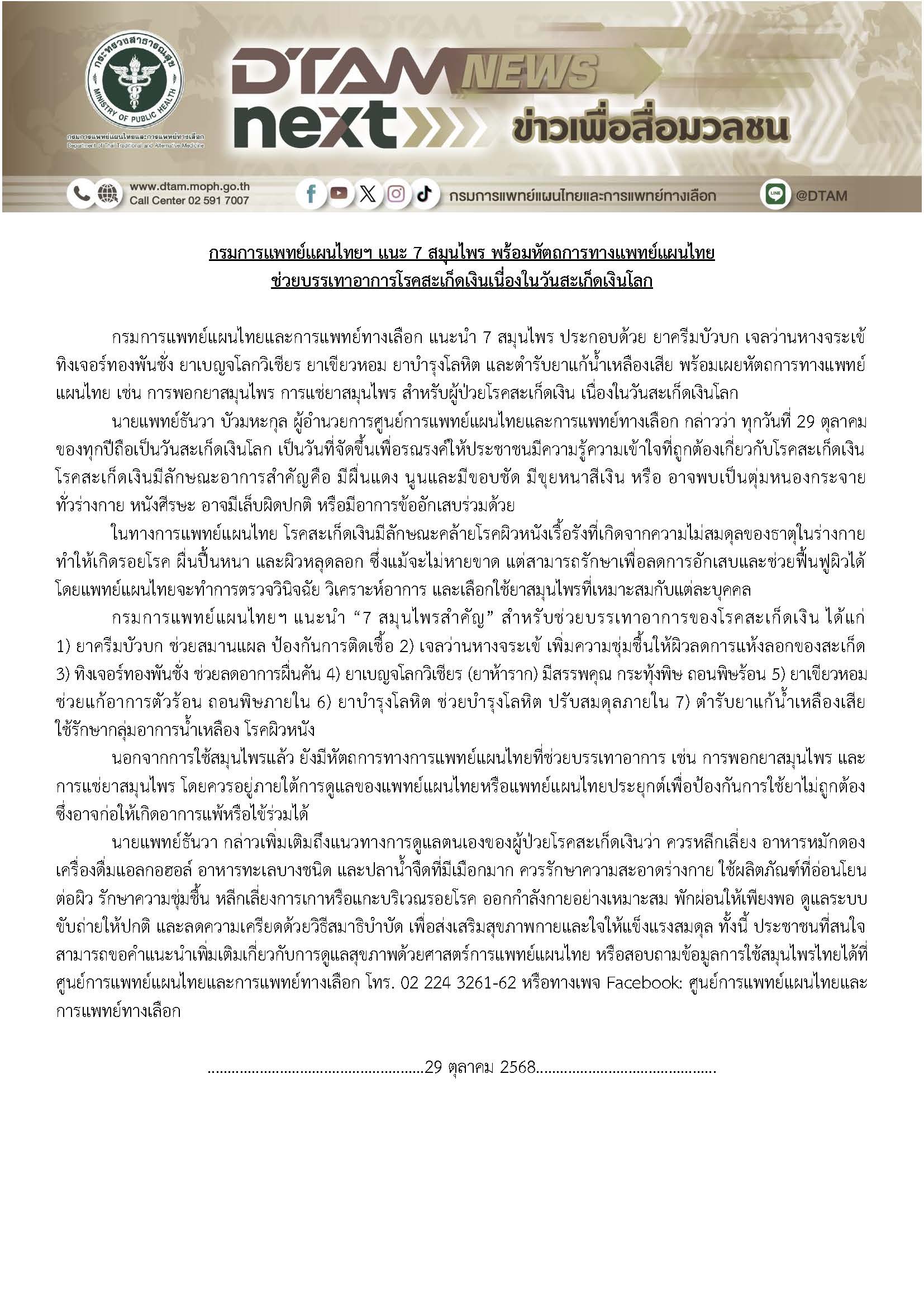 กรมการแพทย์แผนไทยฯ แนะ 7 สมุนไพร พร้อมหัตถการทางแพทย์แผนไทย ช่วยบรรเทาอาการโรคสะเก็ดเงินเนื่องในวันสะเก็ดเงินโลก