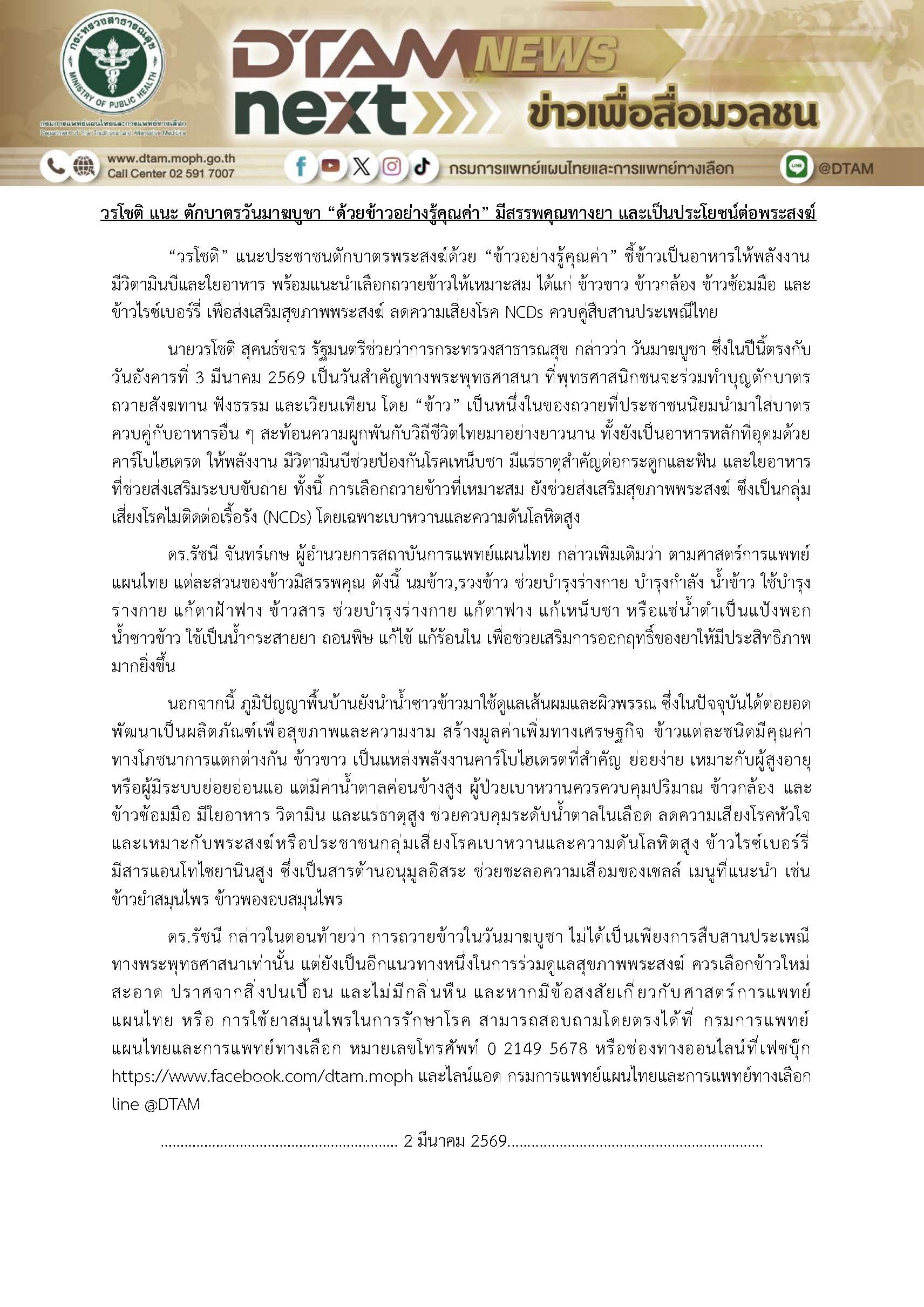 "วรโชติ" แนะ ตักบาตรวันมาฆบูชา "ด้วยข้าวอย่างรู้คุณค่า" มีสรรพคุณทางยา และเป็นประโยชน์ต่อพระสงฆ์