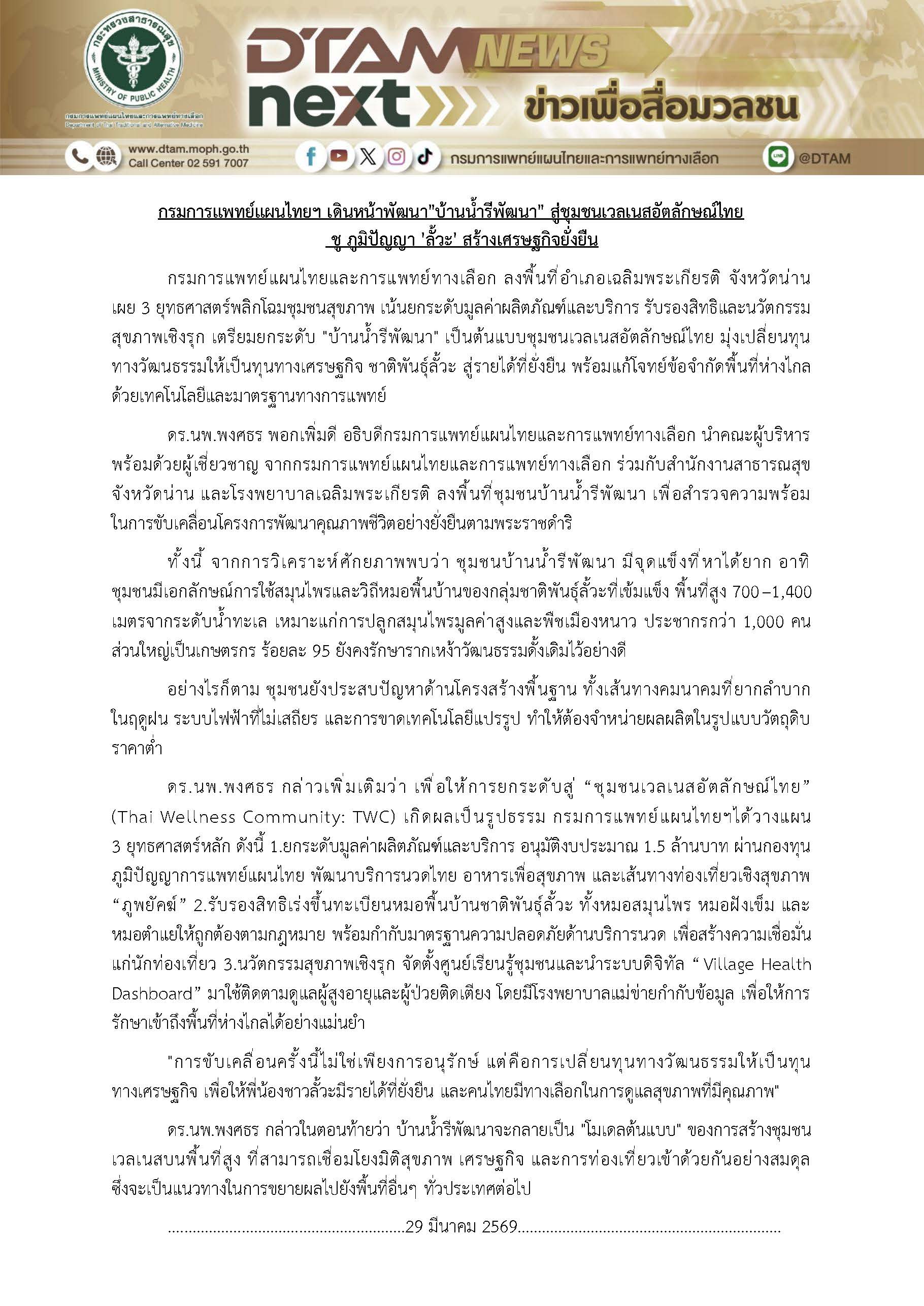 กรมการแพทย์แผนไทยฯ เดินหน้าพัฒนา "บ้านน้ำรีพัฒนา" สู่ชุมชนเวลเนสอัตลักษณ์ไทย ชู ภูมิปัญญา 'ลั้วะ' สร้างเศรษฐกิจยั่งยืน