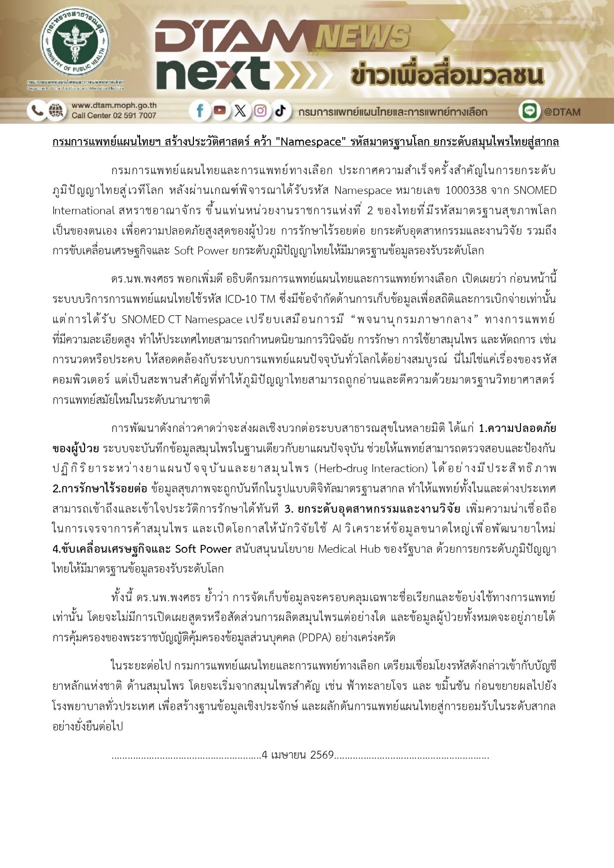 กรมการแพทย์แผนไทยฯ สร้างประวัติศาสตร์ คว้า "Namespace" รหัสมาตรฐานโลก ยกระดับสมุนไพร ไทยสู่สากล
