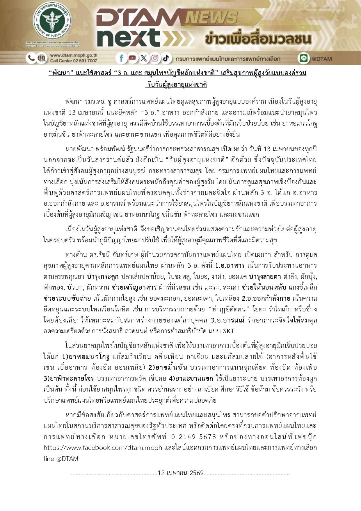 "พัฒนา" แนะใช้ศาสตร์ "3 อ. และสมุนไพรบัญชีหลักแห่งชาติ" เสริมสุขภาพผู้สูงวัยแบบองค์รวมรับวันผู้สูงอายุแห่งชาติ