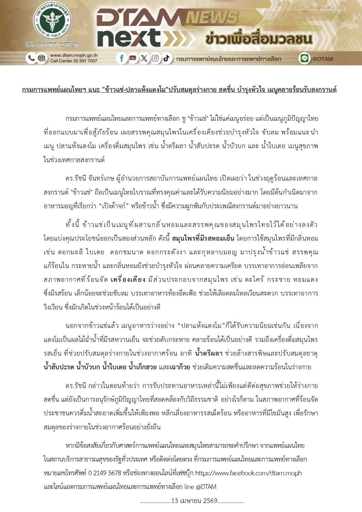 กรมการแพทย์แผนไทยฯ แนะ "ข้าวแช่-ปลาแห้งแตงโม" ปรับสมดุลร่างกาย สดชื่น บำรุงหัวใจ เมนูคลายร้อนรับสงกรานต์
