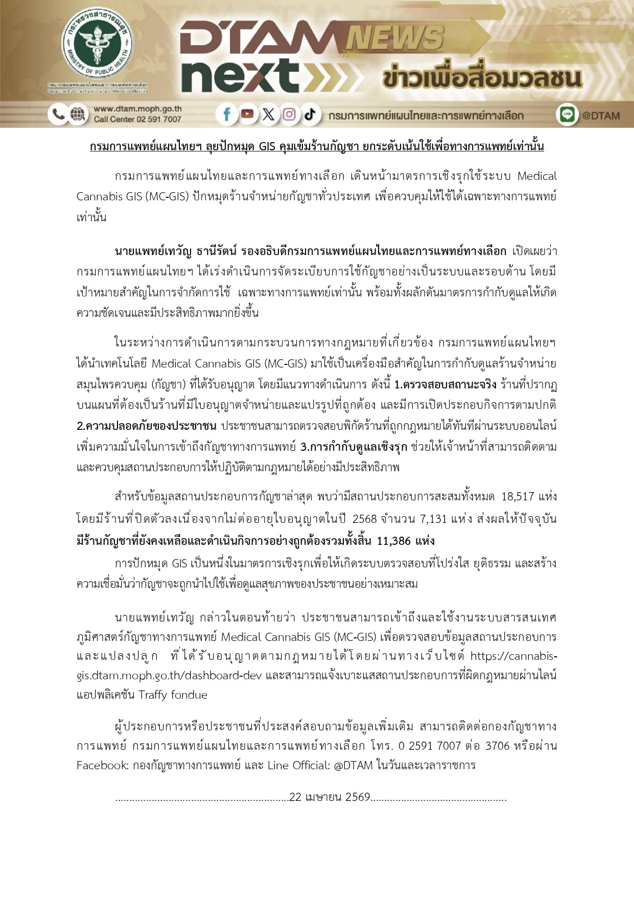 กรมการแพทย์แผนไทยฯ ลุยปักหมุด GIS คุมเข้มร้านกัญชา ยกระดับเน้นใช้เพื่อทางการแพทย์เท่านั้น