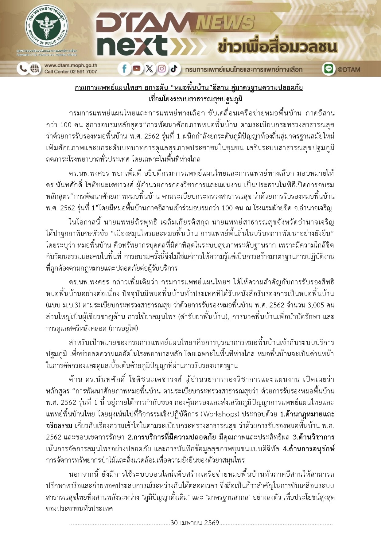กรมการแพทย์แผนไทยฯ ยกระดับ "หมอพื้นบ้าน" อีสาน สู่มาตรฐานความปลอดภัยเชื่อมโยงระบบสาธารณสุขปฐมภูมิ