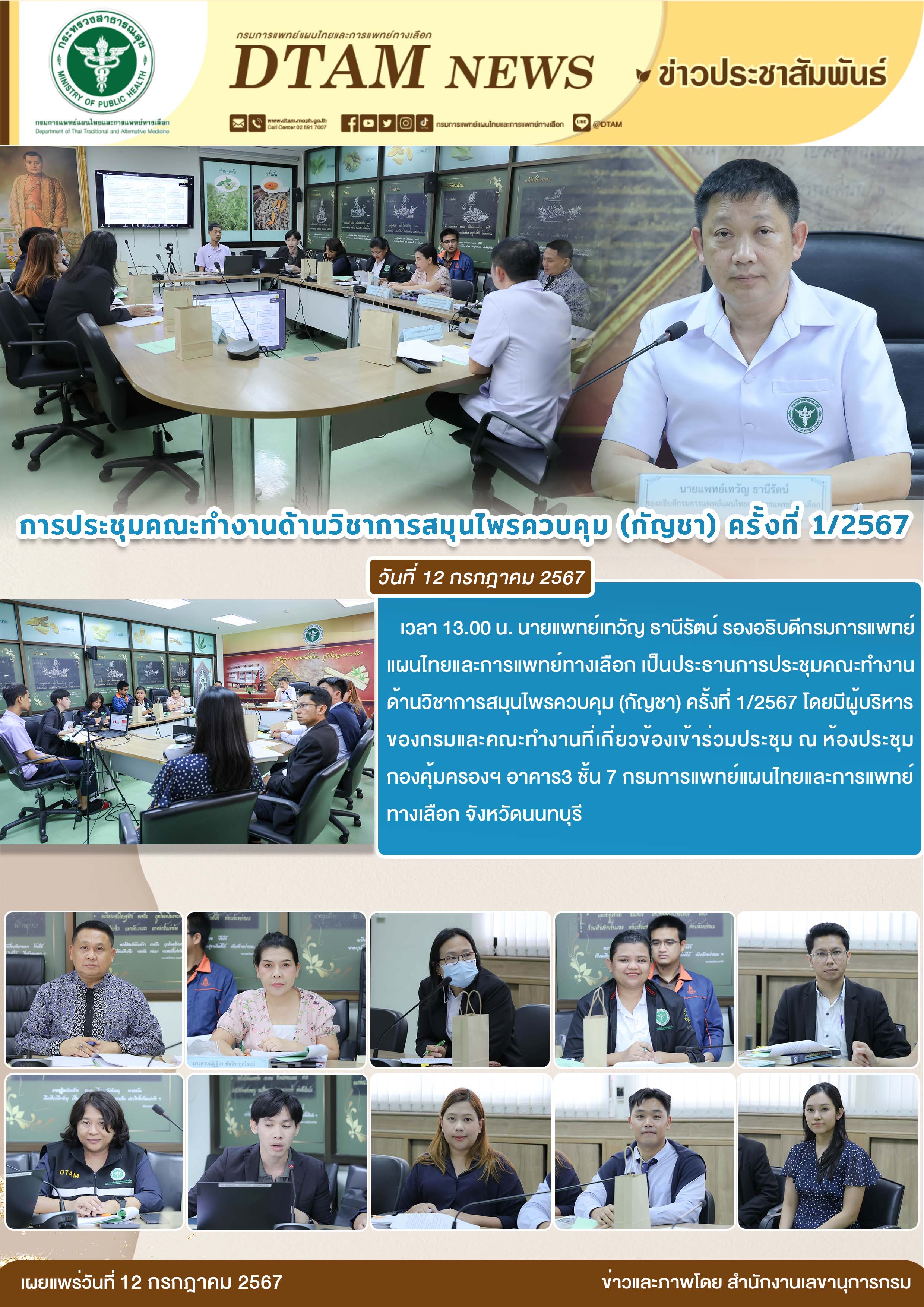 นายแพทย์เทวัญ ธานีรัตน์ รองอธิบดีกรมการแพทย์แผนไทยและการแพทย์ทางเลือก เป็นประธานการประชุมคณะทำงานด้านวิชาการสมุนไพรควบคุม (กัญชา) ครั้งที่ 1/2567 โดยมีผู้บริหารของกรมและคณะทำงานที่เกี่ยวข้องเข้าร่วมประชุม ณ ห้องประชุมกองคุ้มครองฯ อาคาร 3 ชั้น 7 กรมการแพทย์แผนไทยและการแพทย์ทางเลือก จังหวัดนนทบุรี