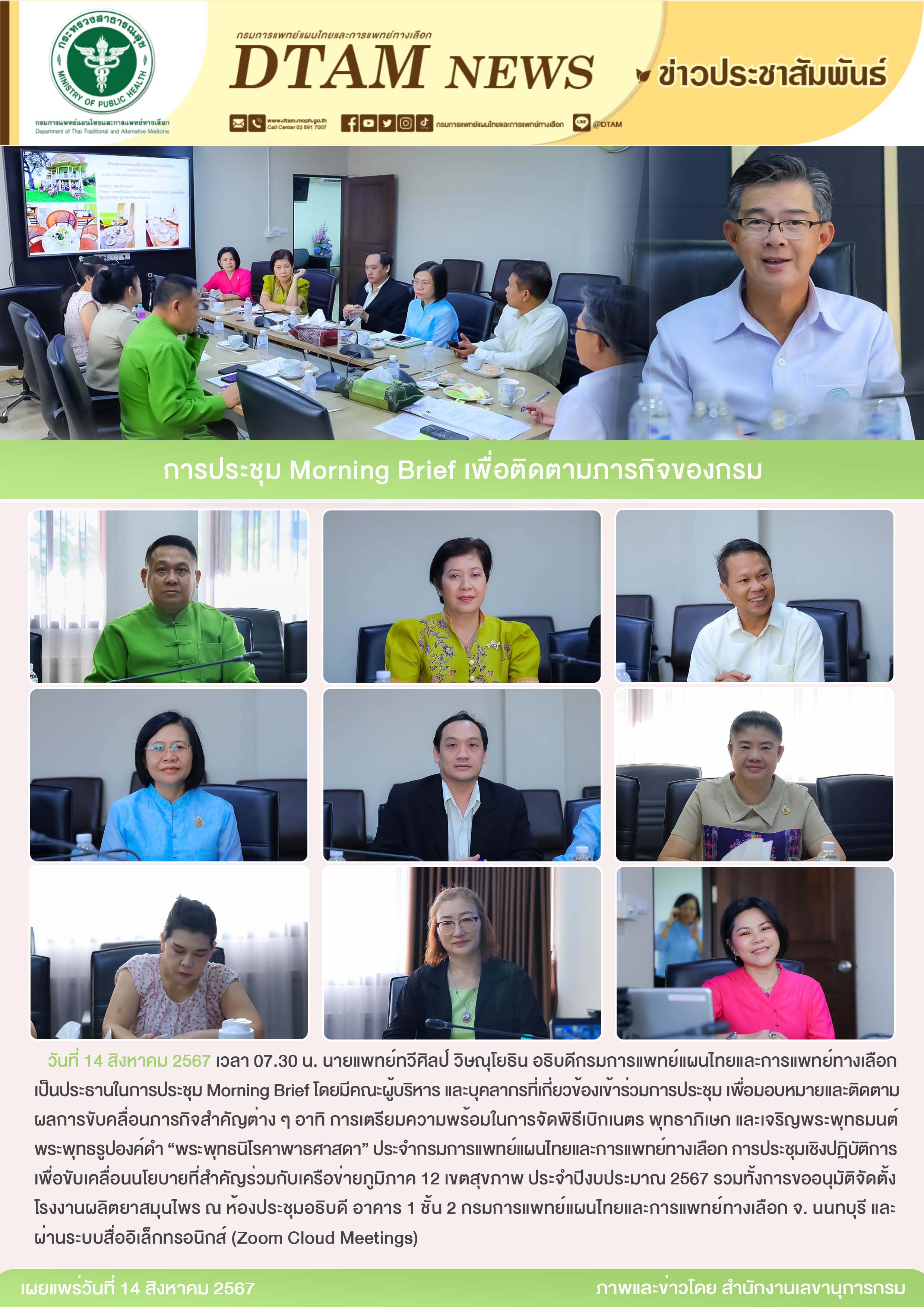 วันที่ 14 สิงหาคม 2567 เวลา 07.30 น. นายแพทย์ทวีศิลป์ วิษณุโยธิน อธิบดีกรมการแพทย์แผนไทยและการแพทย์ทางเลือก เป็นประธานในการประชุม Morning Brief โดยมีคณะผู้บริหาร และบุคลากรที่เกี่ยวข้องเข้าร่วมการประชุม เพื่อมอบหมายและติดตามผลการขับคลื่อนภารกิจสำคัญต่าง ๆ อาทิ การเตรียมความพร้อมในการจัดพิธีเบิกเนตร พุทธาภิเษก และเจริญพระพุทธมนต์ พระพุทธรูปองค์ดำ “พระพุทธนิโรคาพาธศาสดา” ประจำกรมการแพทย์แผนไทยและการแพทย์ทางเลือก การประชุมเชิงปฏิบัติการ เพื่อขับเคลื่อนนโยบายที่สำคัญร่วมกับเครือข่ายภูมิภาค 12 เขตสุขภาพ ประจำปีงบประมาณ 2567 รวมทั้งการขออนุมัติจัดตั้งโรงงานผลิตยาสมุนไพร ณ ห้องประชุมอธิบดี อาคาร 1 ชั้น 2 กรมการแพทย์แผนไทยและการแพทย์ทางเลือก จ. นนทบุรี และผ่านระบบสื่ออิเล็กทรอนิกส์ (Zoom Cloud Meetings)