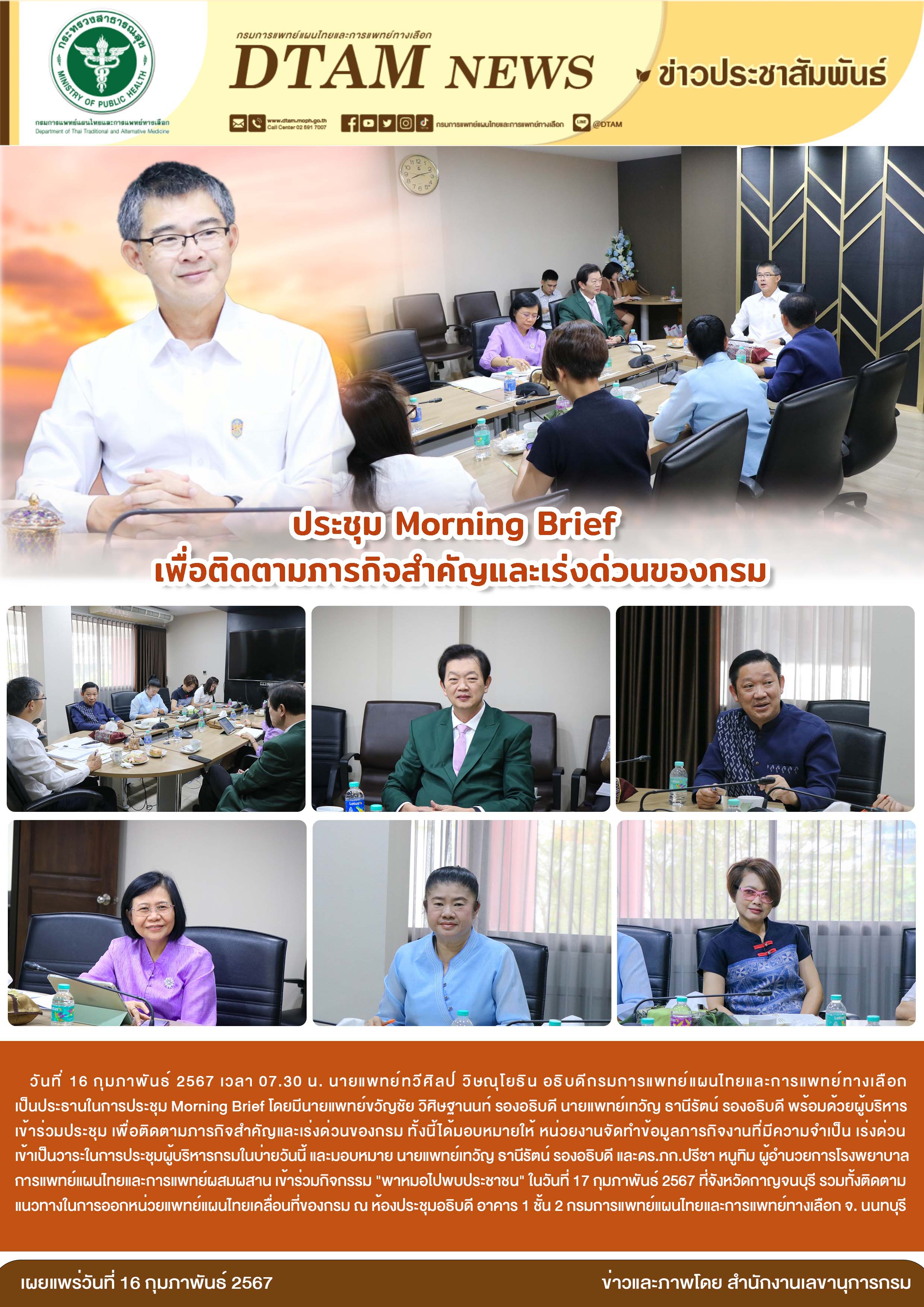 วันที่ 16 กุมภาพันธ์ 2567 เวลา 07.30 น. นายแพทย์ทวีศิลป์ วิษณุโยธิน อธิบดีกรมการแพทย์แผนไทยและการแพทย์ทางเลือก เป็นประธานในการประชุม Morning Brief โดยมีนายแพทย์ขวัญชัย วิศิษฐานนท์ รองอธิบดี นายแพทย์เทวัญ ธานีรัตน์ รองอธิบดี พร้อมด้วยผู้บริหาร เข้าร่วมประชุม เพื่อติดตามภารกิจสำคัญและเร่งด่วนของกรม ทั้งนี้ได้มอบหมายให้ หน่วยงานจัดทำข้อมูลภารกิจงานที่มีความจำเป็น เร่งด่วน เข้าเป็นวาระในการประชุมผู้บริหารกรมในบ่ายวันนี้ และมอบหมาย นายแพทย์เทวัญ ธานีรัตน์ รองอธิบดี และดร.ภก.ปรีชา หนูทิม ผู้อำนวยการโรงพยาบาลการแพทย์แผนไทยและการแพทย์ผสมผสาน เข้าร่วมกิจกรรม “พาหมอไปพบประชาชน” ในวันที่ 17 กุมภาพันธ์ 2567 ที่จังหวัดกาญจนบุรี รวมทั้งติดตามแนวทางในการออกหน่วยแพทย์แผนไทยเคลื่อนที่ของกรม ณ ห้องประชุมอธิบดี อาคาร 1 ชั้น 2 กรมการแพทย์แผนไทยและการแพทย์ทางเลือก จ. นนทบุรี