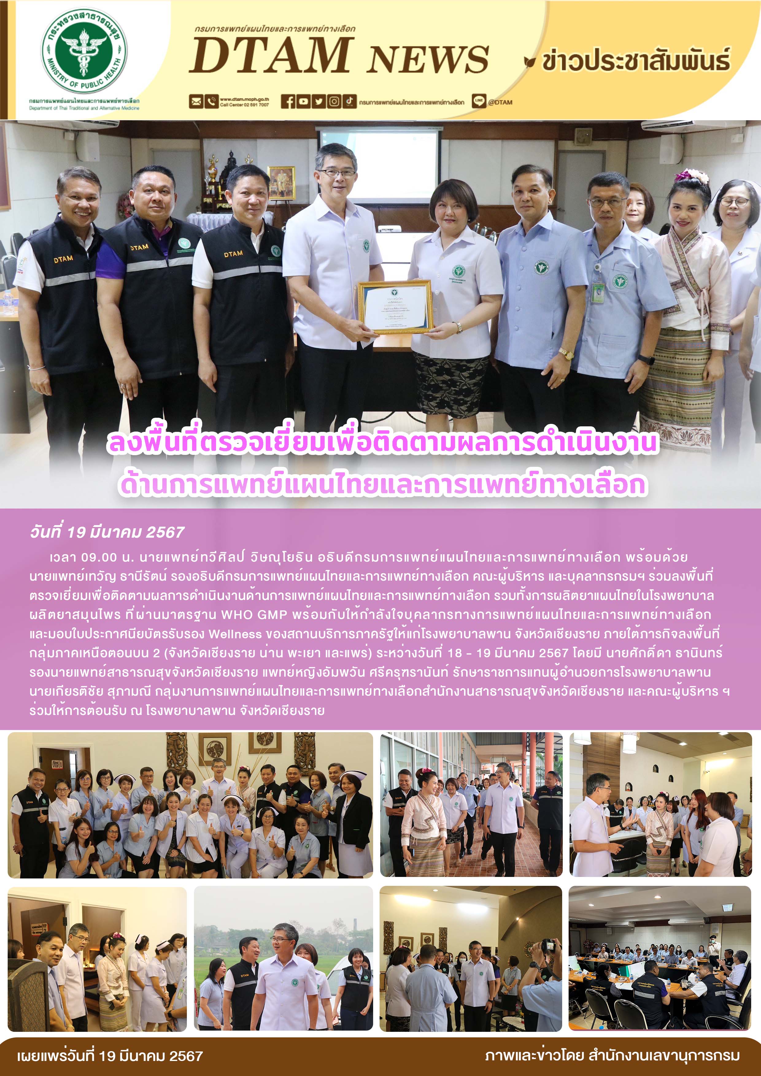 วันที่ 19 มีนาคม 2567 เวลา 09.00 น. นายแพทย์ทวีศิลป์ วิษณุโยธิน อธิบดีกรมการแพทย์แผนไทยและการแพทย์ทางเลือก พร้อมด้วย นายแพทย์เทวัญ ธานีรัตน์ รองอธิบดีกรมการแพทย์แผนไทยและการแพทย์ทางเลือก คณะผู้บริหาร และบุคลากรกรมฯ ร่วมลงพื้นที่ตรวจเยี่ยมเพื่อติดตามผลการดำเนินงานด้านการแพทย์แผนไทยและการแพทย์ทางเลือก รวมทั้งการผลิตยาแผนไทยในโรงพยาบาลผลิตยาสมุนไพร ที่ผ่านมาตรฐาน WHO GMP พร้อมกับให้กำลังใจบุคลากรทางการแพทย์แผนไทยและการแพทย์ทางเลือก และมอบใบประกาศนียบัตรรับรอง Wellness ของสถานบริการภาครัฐให้แก่โรงพยาบาลพาน จังหวัดเชียงราย ภายใต้ภารกิจลงพื้นที่กลุ่มภาคเหนือตอนบน 2 (จังหวัดเชียงราย น่าน พะเยา และแพร่) ระหว่างวันที่ 18 – 19 มีนาคม 2567 โดยมี นายศักดิ์ดา ธานินทร์ รองนายแพทย์สาธารณสุขจังหวัดเชียงราย แพทย์หญิงอัมพวัน ศรีครุฑรานันท์ รักษาราชการแทนผู้อำนวยการโรงพยาบาลพาน นายเกียรติชัย สุภามณี กลุ่มงานการแพทย์แผนไทยและการแพทย์ทางเลือกสำนักงานสาธารณสุขจังหวัดเชียงราย และคณะผู้บริหาร ฯ ร่วมให้การต้อนรับ ณ โรงพยาบาลพาน จังหวัดเชียงราย