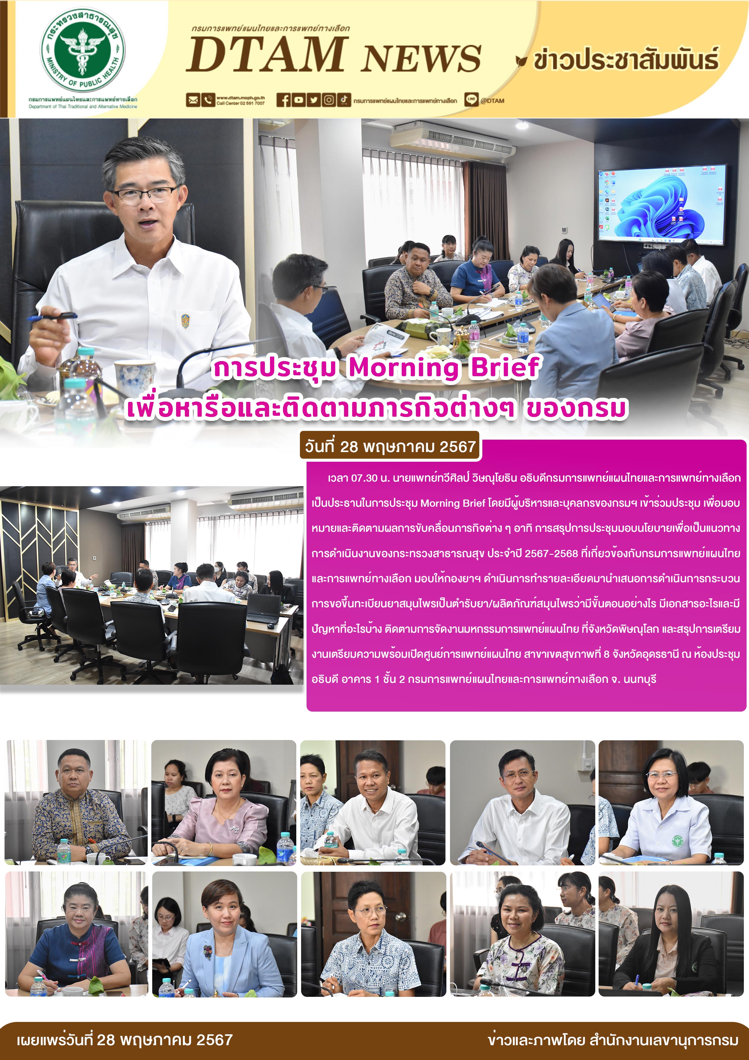 วันที่ 28 พฤษภาคม 2567 เวลา 07.30 น. นายแพทย์ทวีศิลป์ วิษณุโยธิน อธิบดีกรมการแพทย์แผนไทยและการแพทย์ทางเลือก เป็นประธานในการประชุม Morning Brief โดยมีผู้บริหารและบุคลกรของกรมฯ เข้าร่วมประชุม เพื่อมอบหมายและติดตามผลการขับคลื่อนภารกิจต่าง ๆ อาทิ การสรุปการประชุมมอบนโยบายเพื่อเป็นแนวทางการดำเนินงานของกระทรวงสาธารณสุข ประจำปี 2567-2568 ที่เกี่ยวข้องกับกรมการแพทย์แผนไทยและการแพทย์ทางเลือก มอบให้กองยาฯ ดำเนินการทำรายละเอียดมานำเสนอการดำเนินการกระบวนการขอขึ้นทะเบียนยาสมุนไพรเป็นตำรับยา/ผลิตภัณฑ์สมุนไพรว่ามีขั้นตอนอย่างไร มีเอกสารอะไรและมีปัญหาที่อะไรบ้าง ติดตามการจัดงานมหกรรมการแพทย์แผนไทย ที่จังหวัดพิษณุโลก และสรุปการเตรียมงานเตรียมความพร้อมเปิดศูนย์การแพทย์แผนไทย สาขาเขตสุขภาพที่ 8 จังหวัดอุดรธานี ณ ห้องประชุมอธิบดี อาคาร 1 ชั้น 2 กรมการแพทย์แผนไทยและการแพทย์ทางเลือก จ. นนทบุรี