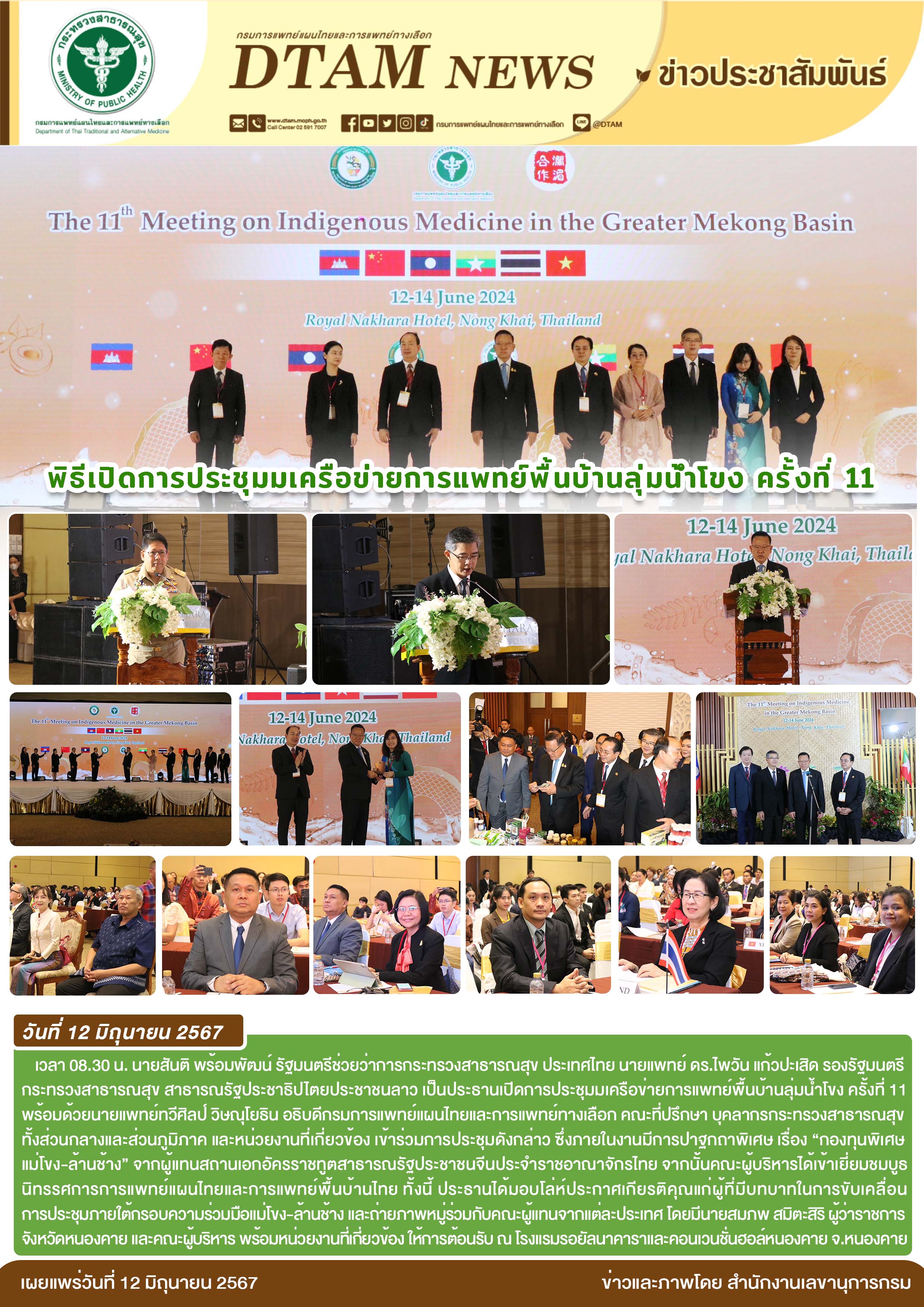 วันที่ 12 มิถุนายน 2567 เวลา 08.30 น. นายสันติ พร้อมพัฒน์ รัฐมนตรีช่วยว่าการกระทรวงสาธารณสุข ประเทศไทย นายแพทย์ ดร.ไพวัน แก้วปะเสิด รองรัฐมนตรีกระทรวงสาธารณสุข สาธารณรัฐประชาธิปไตยประชาชนลาว เป็นประธานเปิดการประชุมเครือข่ายการแพทย์พื้นบ้านลุ่มน้ำโขง ครั้งที่ 11 พร้อมด้วยนายแพทย์ทวีศิลป์ วิษณุโยธิน อธิบดีกรมการแพทย์แผนไทยและการแพทย์ทางเลือก คณะที่ปรึกษา บุคลากรกระทรวงสาธารณสุขทั้งส่วนกลางและส่วนภูมิภาค และหน่วยงานที่เกี่ยวข้อง เข้าร่วมการประชุมดังกล่าว ซึ่งภายในงานมีการปาฐกถาพิเศษ เรื่อง “กองทุนพิเศษแม่โขง-ล้านช้าง” จากผู้แทนสถานเอกอัครราชทูตสาธารณรัฐประชาชนจีนประจำราชอาณาจักรไทย จากนั้นคณะผู้บริหารได้เข้าเยี่ยมชมบูธนิทรรศการการแพทย์แผนไทยและการแพทย์พื้นบ้านไทย ทั้งนี้ ประธานได้มอบโล่ห์ประกาศเกียรติคุณแก่ผู้ที่มีบทบาทในการขับเคลื่อนการประชุมภายใต้กรอบความร่วมมือแม่โขง-ล้านช้าง และถ่ายภาพหมู่ร่วมกับคณะผู้แทนจากแต่ละประเทศ โดยมีนายสมภพ สมิตะสิริ ผู้ว่าราชการจังหวัดหนองคาย และคณะผู้บริหาร พร้อมหน่วยงานที่เกี่ยวข้อง ให้การต้อนรับ ณ โรงแรมรอยัลนาคาราและคอนเวนชั่นฮอล์หนองคาย จ.หนองคาย