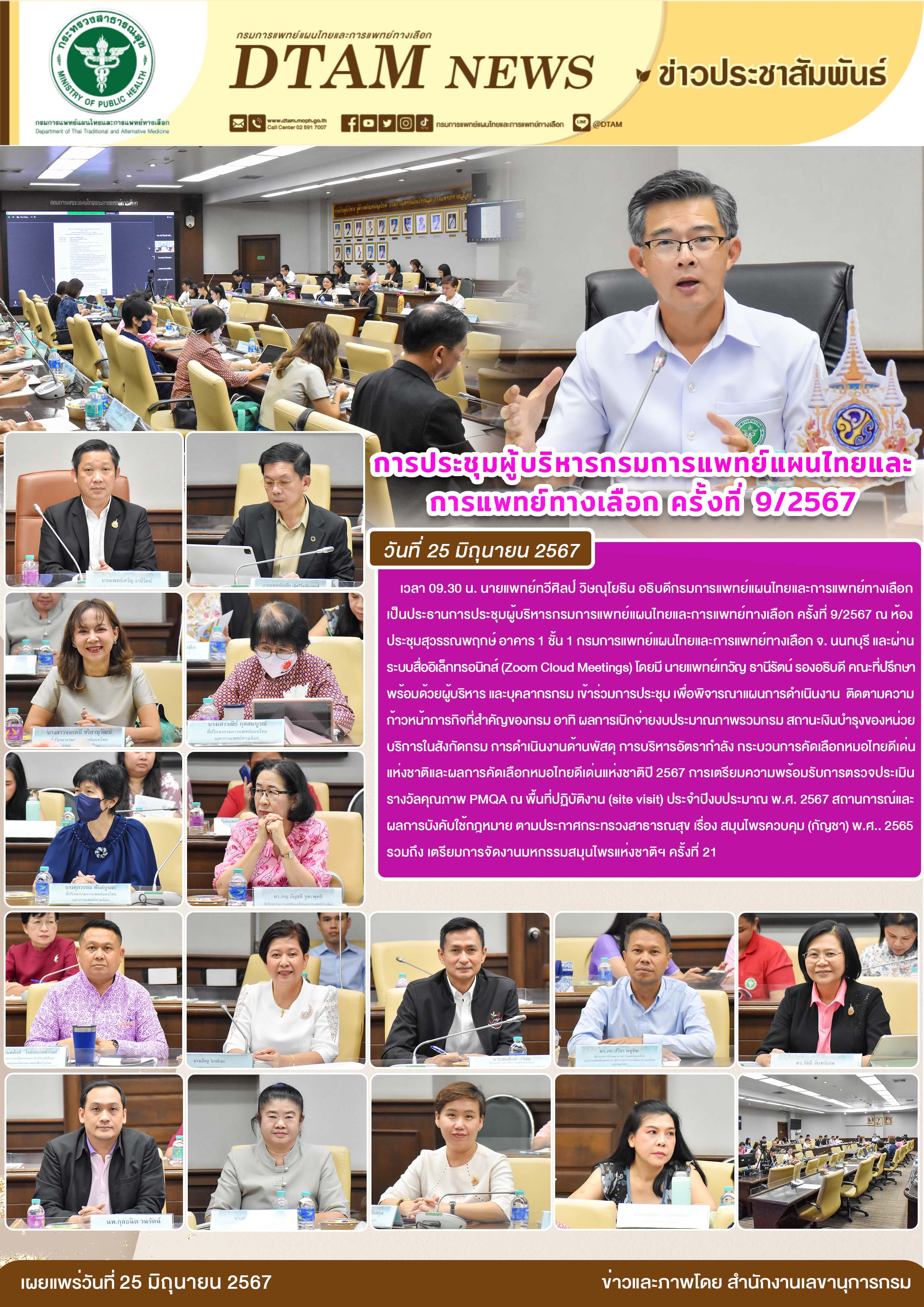 วันที่ 25 มิถุนายน 2567 เวลา 09.30 น. นายแพทย์ทวีศิลป์ วิษณุโยธิน อธิบดีกรมการแพทย์แผนไทยและการแพทย์ทางเลือก เป็นประธานการประชุมผู้บริหารกรมการแพทย์แผนไทยและการแพทย์ทางเลือก ครั้งที่ 9/2567 ณ ห้องประชุมสุวรรณพฤกษ์ อาคาร 1 ชั้น 1 กรมการแพทย์แผนไทยและการแพทย์ทางเลือก จ. นนทบุรี และผ่านระบบสื่ออิเล็กทรอนิกส์ (Zoom Cloud Meetings) โดยมี นายแพทย์เทวัญ ธานีรัตน์ รองอธิบดี คณะที่ปรึกษา พร้อมด้วยผู้บริหาร และบุคลากรกรม เข้าร่วมการประชุม เพื่อพิจารณาแผนการดำเนินงาน ติดตามความก้าวหน้าภารกิจที่สำคัญของกรม อาทิ ผลการเบิกจ่ายงบประมาณภาพรวมกรม สถานะเงินบำรุงของหน่วยบริการในสังกัดกรม การดำเนินงานด้านพัสดุ การบริหารอัตรากำลัง กระบวนการคัดเลือกหมอไทยดีเด่นแห่งชาติและผลการคัดเลือกหมอไทยดีเด่นแห่งชาติปี 2567 การเตรียมความพร้อมรับการตรวจประเมินรางวัลคุณภาพ PMQA ณ พื้นที่ปฏิบัติงาน (site visit) ประจำปีงบประมาณ พ.ศ. 2567 สถานการณ์และผลการบังคับใช้กฎหมาย ตามประกาศกระทรวงสาธารณสุข เรื่อง สมุนไพรควบคุม (กัญชา) พ.ศ.. 2565 รวมถึง เตรียมการจัดงานมหกรรมสมุนไพรแห่งชาติฯ ครั้งที่ 21