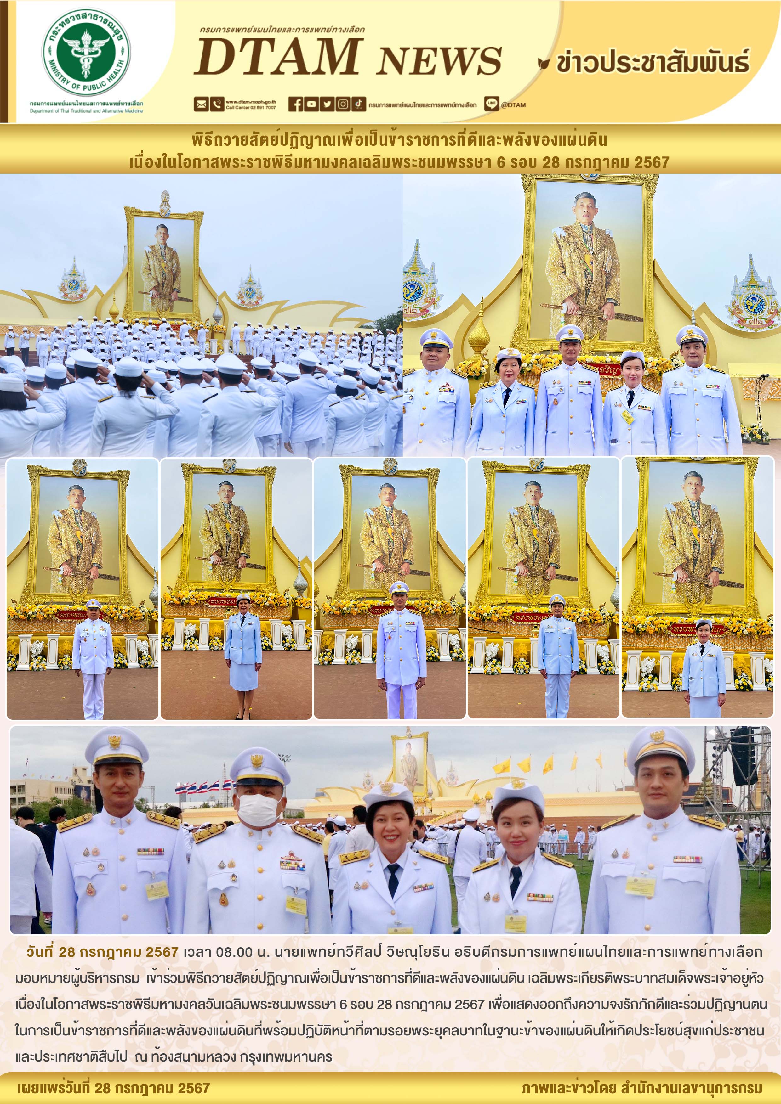 วันที่ 28 กรกฎาคม 2567 เวลา 08.00 น. นายแพทย์ทวีศิลป์ วิษณุโยธิน อธิบดีกรมการแพทย์แผนไทยและการแพทย์ทางเลือก มอบหมายผู้บริหารกรม เข้าร่วมพิธีถวายสัตย์ปฏิญาณเพื่อเป็นข้าราชการที่ดีและพลังของแผ่นดิน เฉลิมพระเกียรติพระบาทสมเด็จพระเจ้าอยู่หัว เนื่องในโอกาสพระราชพิธีมหามงคลวันเฉลิมพระชนมพรรษา 6 รอบ 28 กรกฎาคม 2567 เพื่อแสดงออกถึงความจงรักภักดีและร่วมปฏิญานตนในการเป็นข้าราชการที่ดีและพลังของแผ่นดินที่พร้อมปฏิบัติหน้าที่ตามรอยพระยุคลบาทในฐานะข้าของแผ่นดินให้เกิดประโยชน์สุขแก่ประชาชนและประเทศชาติสืบไป ณ ท้องสนามหลวง กรุงเทพมหานคร