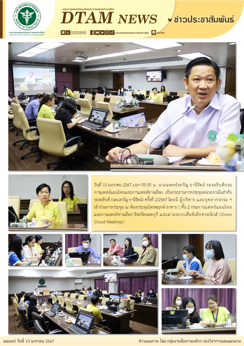 วันที่ 15 มกราคม 2567 เวลา 09.30 น. นายแพทย์เทวัญ ธานีรัตน์ รองอธิบดีกรม การแพทย์แผนไทยและการแพทย์ทางเลือก เป็นประธานการประชุมหน่วยงานในกำกับ รองอธิบดี (นพ.เทวัญ ธานีรัตน์) ครั้งที่ 2/2567 โดยมี ผู้บริหาร และบุคลากรกรม ฯ เข้าร่วมการประชุม ณ ห้องประชุมไพรพฤกษ์ อาคาร 1 ชั้น 2 กรมการแพทย์แผนไทยและการแพทย์ทางเลือก จังหวัดนนทบุรี และผ่านระบบสื่ออิเล็กทรอนิกส์ (Zoom Cloud Meetings)